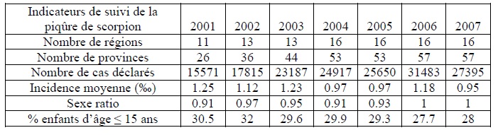 Le nombre de régions et de provinces déclarantes a augmenté d’une année à l’autre. Ceci est du à la sensibilisation de toutes les provinces médicales pour la déclaration et à l’intégration en 2002 du thème « piqûre de scorpion » dans la formation continue de toutes les provinces médicales.