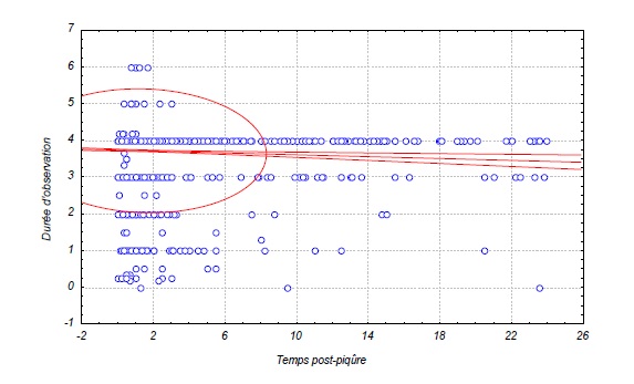 En effet, on observe une diminution de la durée d’observation avec l’augmentation du temps post piqûre. Cependant, le calcul du coefficient de corrélation entre le temps post piqûre et la durée d’observation donne une valeur de 0.052 qui n’est pas significative.