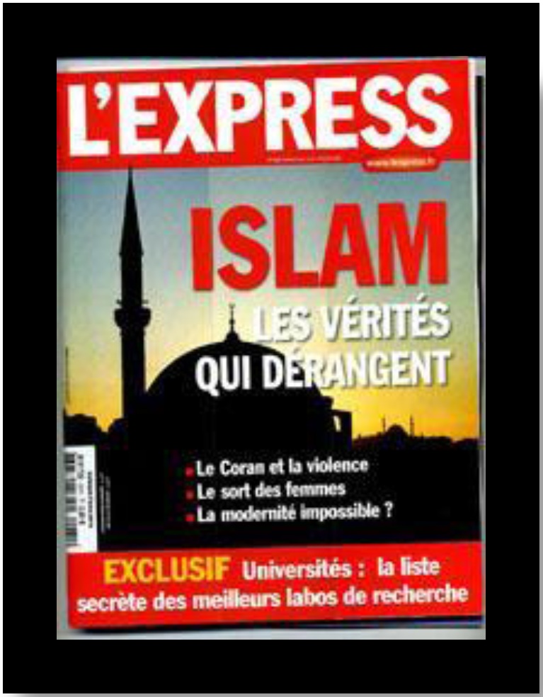 La couverture d’un numéro de L’Express (12 juin 2008) qui reprend tous les stéréotypes traditionnellement accolés à l’islam: la violence, la misogynie et l’archaïsme.
