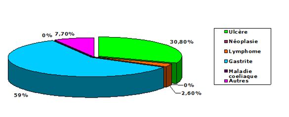 Dans notre étude, chez les patients positifs à Helicobacter pylori aucun cas de néoplasie, de lymphome, ou de maladie cœliaque n’a été retrouvé. En outre, certains patients peuvent présenter une deuxième pathologie gastrique en plus de celle liée à Helicobacter pylori.