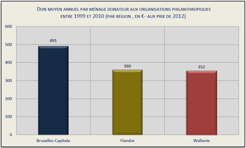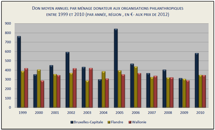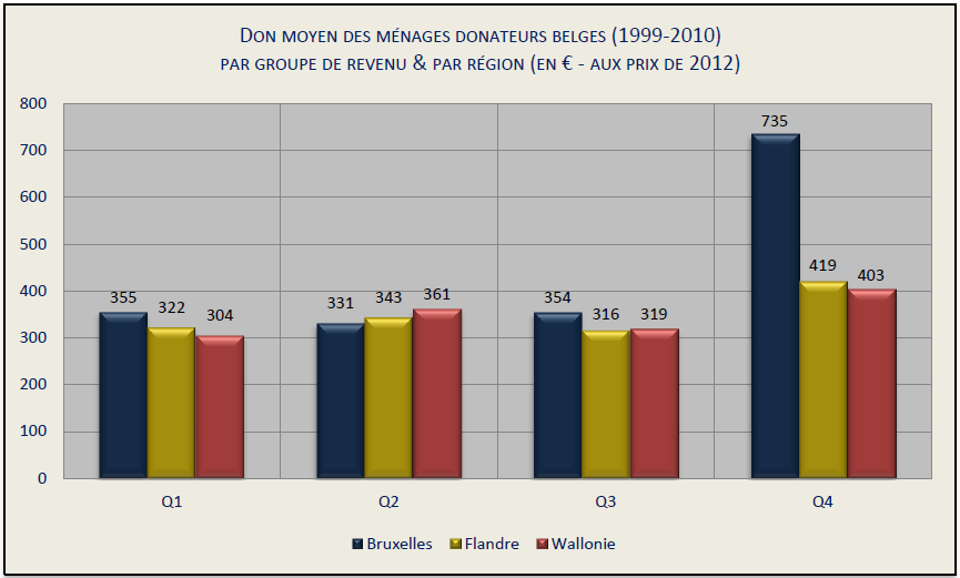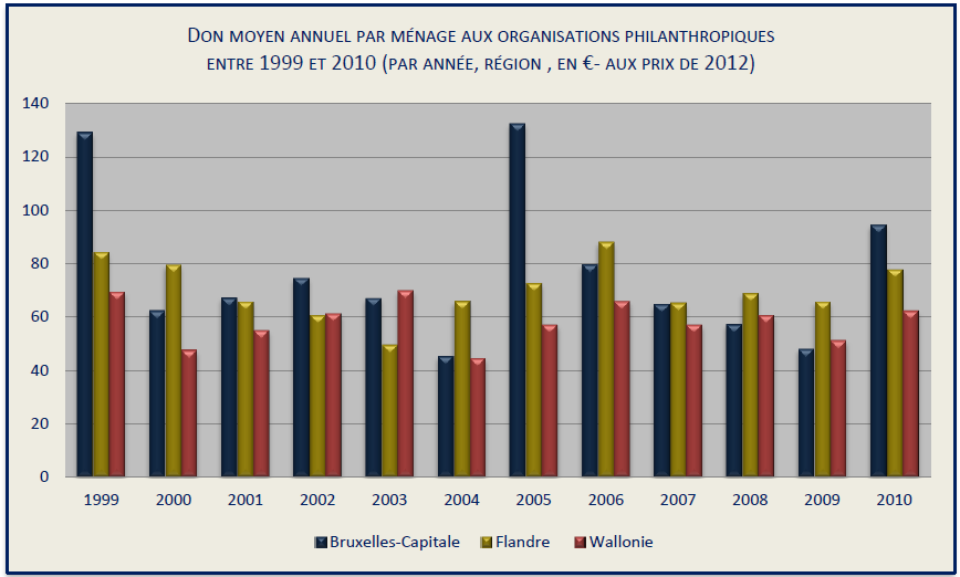 Par contre, le don moyen des ménages donateurs diffère d’une région à une autre ; il est le plus élevé à Bruxelles, puis en Flandre, et la Wallonie ferme la marche. Les indices observés à Bruxelles sont nettement supérieurs à ceux observés en Flandre et en Wallonie ; particulièrement lors de la survenance de crises humanitaires graves. Ce sont le ménages donateurs bruxellois du dernier quartile de revenu – les 25% de ménages bruxellois les plus aisés – qui poussent l’indice vers le haut ; leur don moyen annuel est, entre 1999 et 2010, 1.75 fois plus élevé que celui des ménages donateurs flamands et 1,82 fois plus élevé que celui des ménages donateurs wallons.