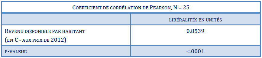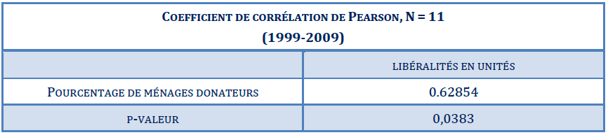 Le pourcentage de ménages donateurs et le nombre de libéralités déclarées sont – comme le montre le tableau Tableau III-2 – corrélés ; le calcul du coefficient de Pearson nous amène à conclure – avec un risque de 5% de se tromper – qu’il existe un lien linéaire significatif entre les deux variables précitées. Le coefficient de corrélation qui les lie a une valeur de 0.6284 – ce qui correspond à un indice relativement élevé.