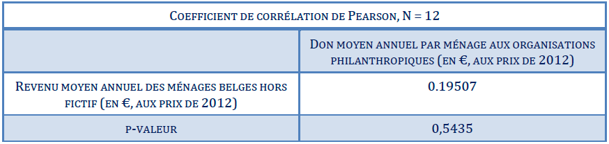 La Figure III-13 dépeint l’absence de lien linéaire significatif entre les deux variables précitées ; l’évolution du don moyen annuel par ménage n’est pas proportionnelle à l’évolution du revenu moyen annuel de ces derniers. Le calcul du coefficient de corrélation de Pearson, relaté dans le Tableau III-4, confirme cette assomption.