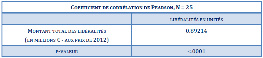 On perçoit aisément que la courbe du montant total des libéralités et la courbe de libéralités en unités évoluent de manière semblable entre 1985 et 2008. Le calcul du coefficient de corrélation de Pearson – relaté dans le Tableau III-1 – nous permet d’ailleurs d’affirmer – avec un risque de se tromper inférieur à 1% – qu’il existe un lien linéaire significatif entre le montant total des libéralités déclarées et le nombre de libéralités déclarées en unités entre 1985 et 2009. Le coefficient de corrélation entre les deux variables précitées s’élève à 0,89214.