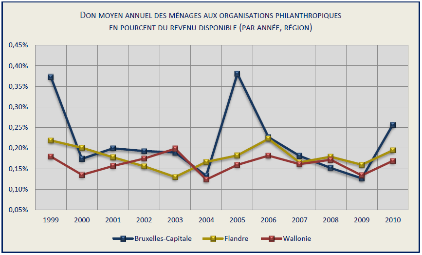 La Flandre, région dans laquelle le revenu moyen annuel par ménage est le plus élevé entre 1999 et 2010, se place en deuxième position avec une valeur du rapport précité qui s’élève à 0,180%. Rappelons que le don moyen annuel par ménage donateur en Flandre est plus élevé qu’en Wallonie mais moins élevé qu’à Bruxelles(12) et que la Flandre est la région qui compte la proportion la plus élevée de ménages donateurs en Belgique(13) ; ce sont ces deux variables qui – mises en relation avec le revenu – influencent la valeur du rapport entre le don moyen annuel et le revenu moyen annuel.