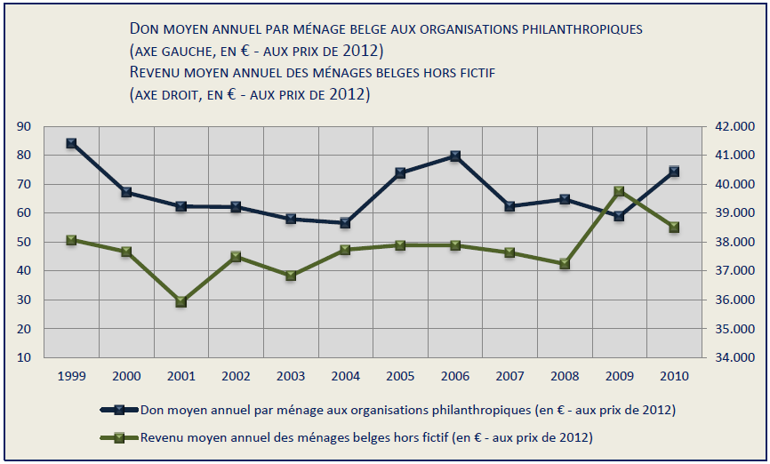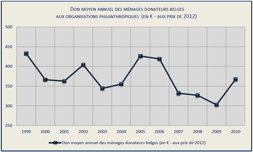 On observe, par contre, une tendance à la diminution du montant moyen des dons déclarés fiscalement par les citoyens du royaume. Les donateurs auraient donc tendance à multiplier leurs dons mais en versant des sommes plus modestes. Le montant moyen du don annuel – déclaré ou non-déclaré – des ménages donateurs belges suit également une tendance décroissante entre 1999 et 2010.