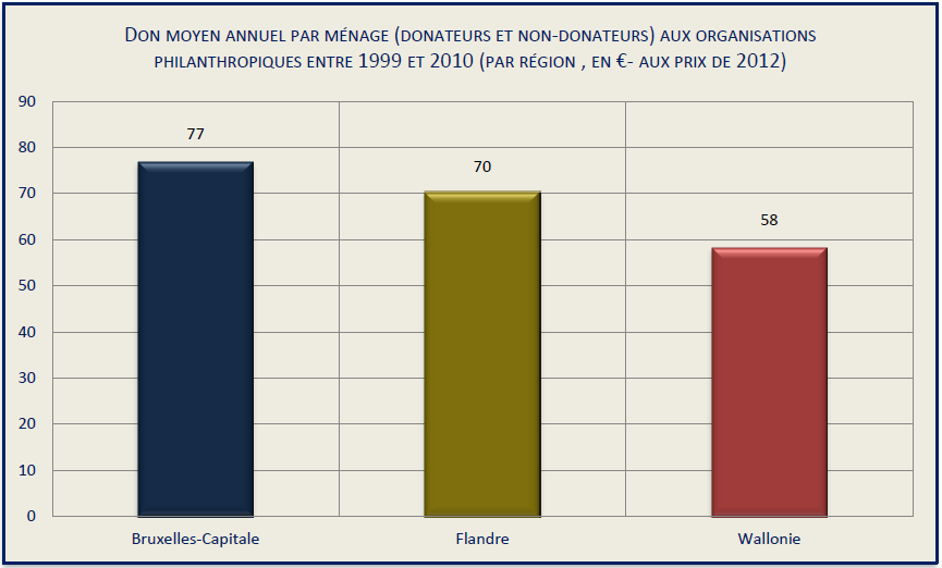 Enfin, la Wallonie est la région pour laquelle le don moyen annuel par ménage est le plus faible ; les ménages wallons donnent en moyenne 58€ par an aux organisations philanthropiques. C’est en Wallonie qu’on a observé les montants les moins élevés pour le don moyen annuel par ménage donateur ; (8) on a également déterminé que proportion de ménages donateurs dans cette même région était inférieure à la moyenne nationale. (9)