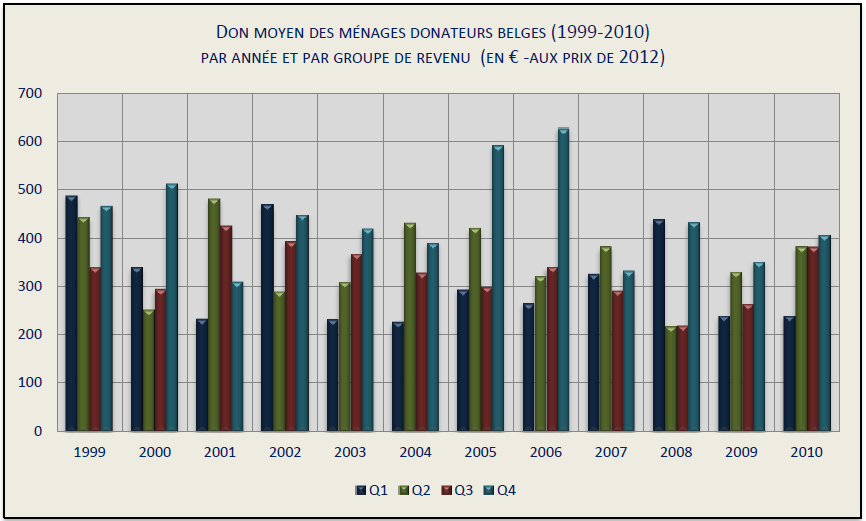 Les seules années au cours desquelles on observe un lien direct entre le quartile de revenu et le don moyen annuel des ménages donateurs sont les années 2003, 2006 et 2010 ; au cours de ces années, le don moyen annuel des ménages donateurs est une fonction croissante du quartile de revenu dans lequel ils se trouvent.