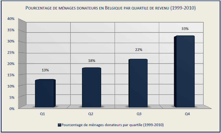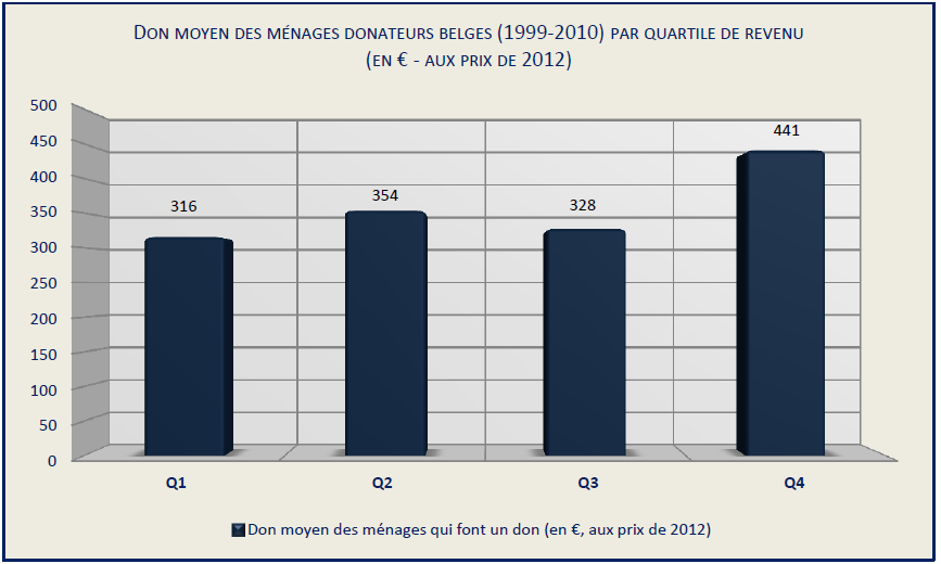 Le pourcentage de ménages donateurs est une fonction croissante du niveau de revenu ; plus le quartile de revenu observé est élevé, plus la proportion de ménage donateurs à l’intérieur du quartile est importante. Le don moyen des ménages donateurs n’est, par contre, pas directement proportionnel au revenu. Le don moyen annuel des ménages donateurs d’un quartile de revenu donné n’est pas forcément plus élevé lorsqu’on passe à un quartile supérieur.