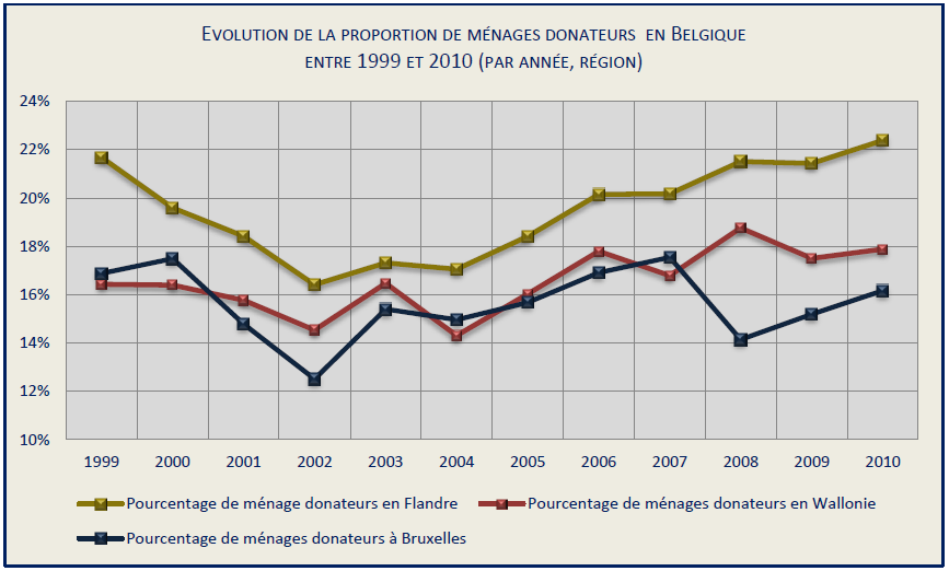 La proportion de ménages donateurs à Bruxelles évolue, par contre, de manière quelque peu différente ; de 1999 à 2000 le pourcentage de ménages qui font des dons croît à Bruxelles alors qu’il décroît dans les deux autres régions du pays et de 2007 à 2008 ce même pourcentage décroît fortement à Bruxelles alors qu’il croît en Flandre et en Wallonie.
