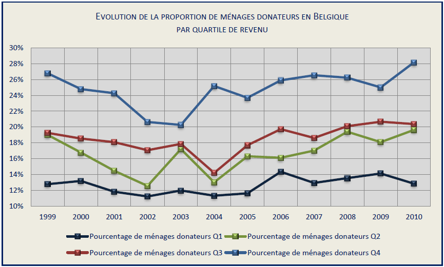 En moyenne, pour la période qui s’étend de 1999 à 2010, 33% des ménages faisant partie du quatrième quartile de revenus ont fait au moins un don sur l’année. Ils sont logiquement suivis, par ordre décroissant de représentation, par les ménages des groupes Q3 – 22% de ménages donateurs –, Q2 – 18% de ménages donateurs –, et Q1 – 13% de ménages donateurs.