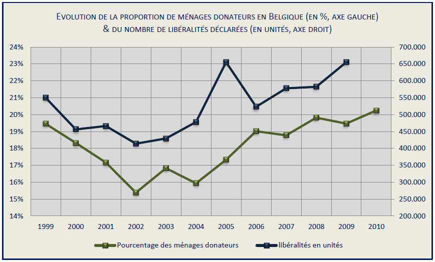 Il y a en Belgique, depuis 1985, une tendance à l’augmentation du nombre de libéralités déclarées par les citoyens ; cette augmentation en nombre entraîne une augmentation du montant total des dons fiscalement déclarés – les deux variables sont fortement corrélées.