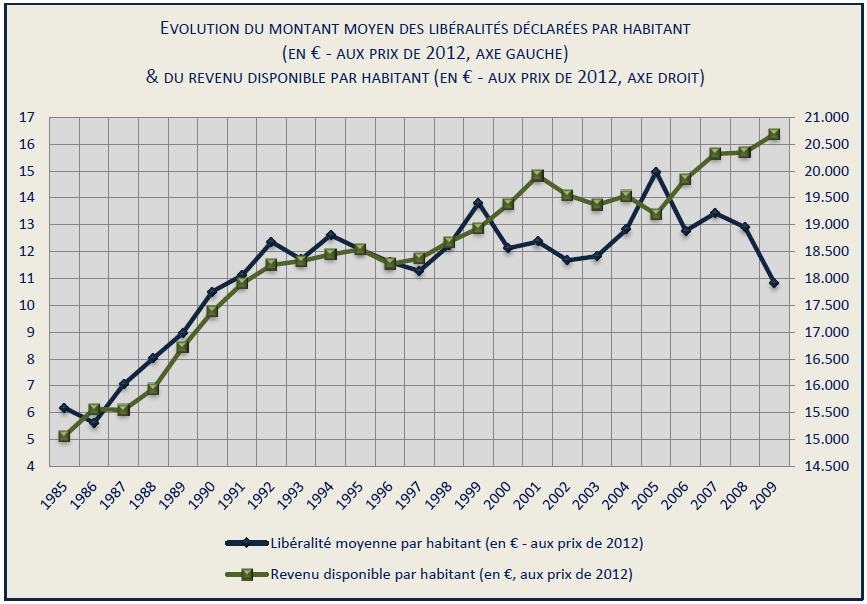 La tendance générale des deux courbes est, entre 1985 et 2009, semblable ; on constate une croissance globale du revenu disponible par habitant et une croissance globale du montant moyen des libéralités déclarées par habitant.