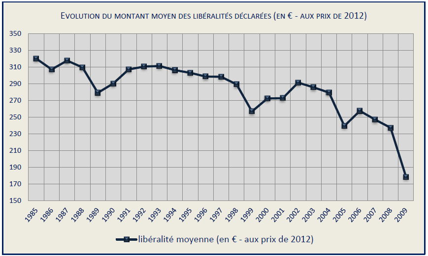 Les libéralités déclarées sont donc de plus en plus nombreuses mais le montant moyen de celles-ci a tendance à baisser. Ceci peut être dû à une modification du comportement des donateurs, qui tendent à multiplier leurs dons mais en versant des sommes plus modestes.