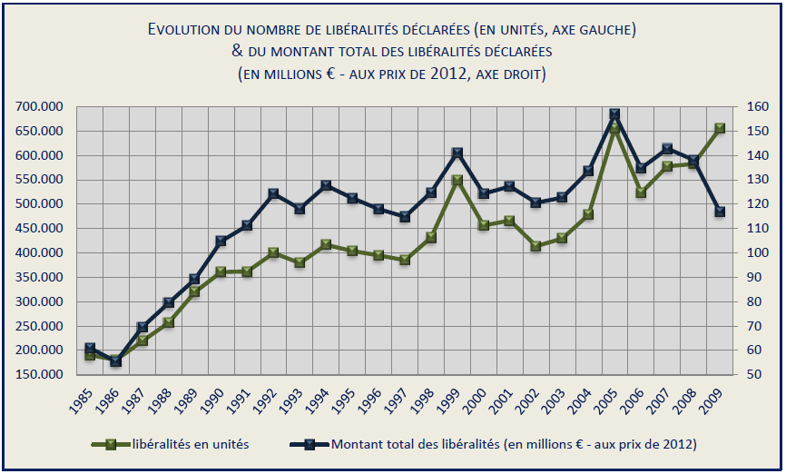 Le montant total des libéralités déclarées a fortement augmenté entre 1986 et 1992, pour ensuite connaître une période de relative stagnation jusque 2002, un regain de croissance entre 2002 et 2005 et une décroissance importante de 2005 à 2009.