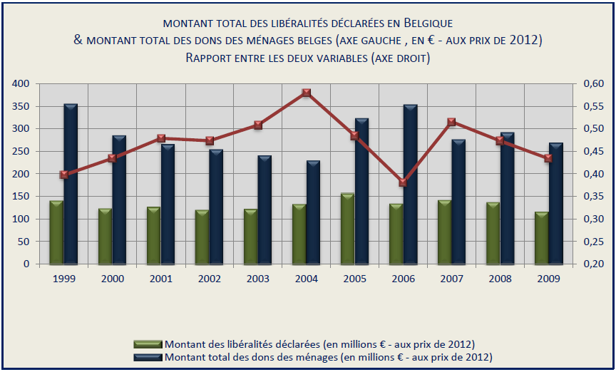 La part non déclarée fiscalement du montant total des dons réalisés par les citoyens belges oscille donc entre 42% et 62% pour la période qui s’étend de 1999 à 2009. Une part importante des dons n’est pas déclarée par les contribuables ; les organisations philanthropiques ont donc l’opportunité de motiver les gens à donner en insistant sur les avantages fiscaux dont ils peuvent bénéficier par après.