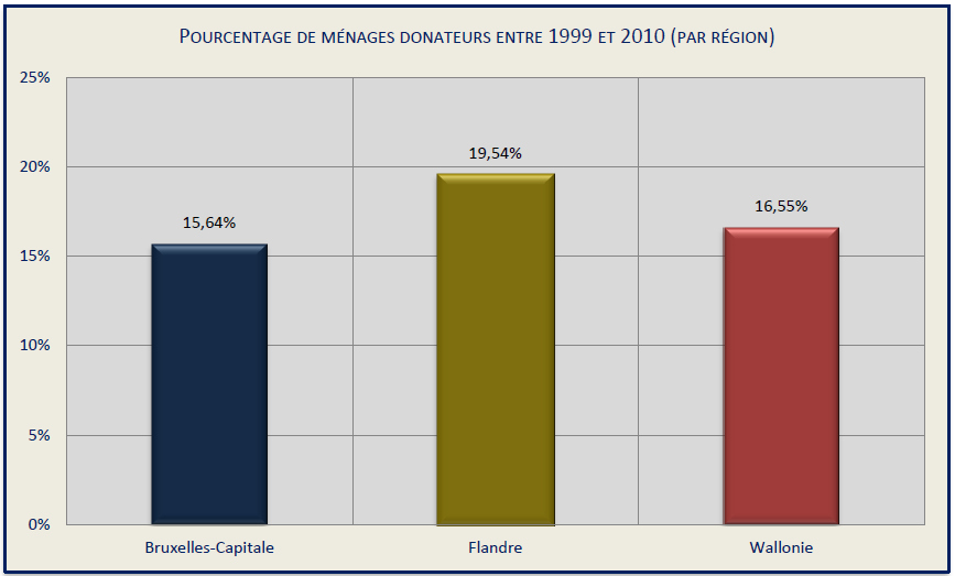 La proportion de ménages donateurs à l’intérieur des frontières est relativement stable ; elle a oscillé, de 1999 à 2010, entre 15 et 20% ; et cette variable semble influencer – sur cette même période – le nombre de libéralités déclarées. C’est en Flandre qu’on retrouve la proportion moyenne de ménages donateurs la plus importante, la Wallonie se place en deuxième position et la région de Bruxelles-Capitale ferme la marche.