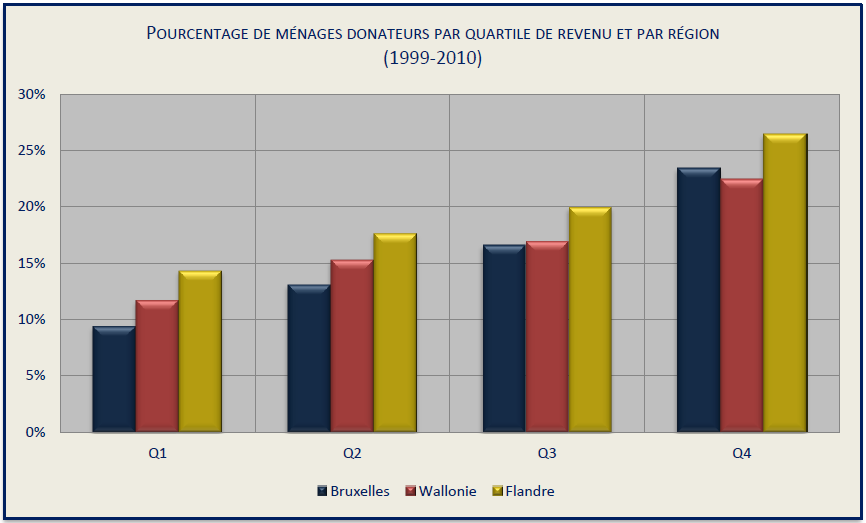 Notons également que les ménages donateurs bruxellois du quatrième quartile de revenu sont ceux qui contribuent le plus nettement à l’indice élevé du don moyen annuel des ménages donateurs de cette région ; leur don moyen annuel pour la période 1999-2010 est 1,75 fois plus élevé que le don moyen annuel des ménages flamands et 1,82 fois plus élevé que celui des ménages wallons. Ils sont par ailleurs, dans ce quartile, proportionnellement plus nombreux à donner que les ménages wallons mais proportionnellement moins nombreux que les ménages flamands.(17)