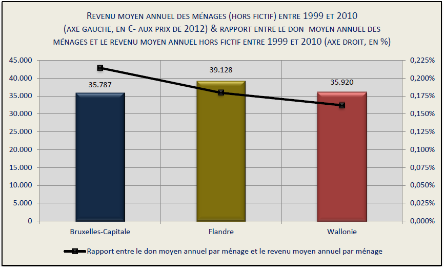 Enfin, le don moyen annuel par ménage (ménages non-donateurs compris) – indice dépendant de la proportion de ménages donateurs, d’une part, et du don moyen des ménages donateurs d’autre part – est le plus élevé à Bruxelles ; la Flandre se classe deuxième, et la Wallonie dernière. L’indice est influencé à Bruxelles par les montants très élevés du don moyen par ménage donateur du dernier quartile de revenu lors de survenance de catastrophes majeures.