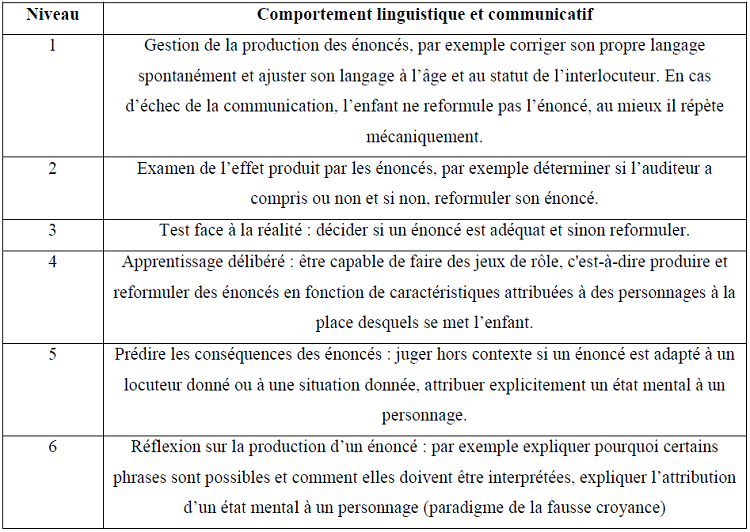 Tableau 3 : Niveaux de compréhension de l’état mental de l’interlocuteur (d’après Bernicot, 1999)