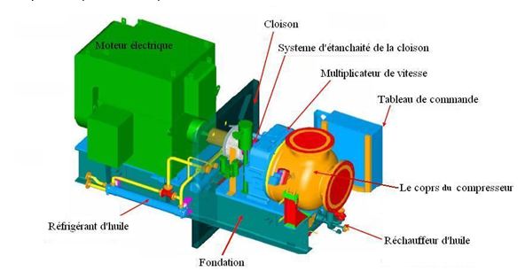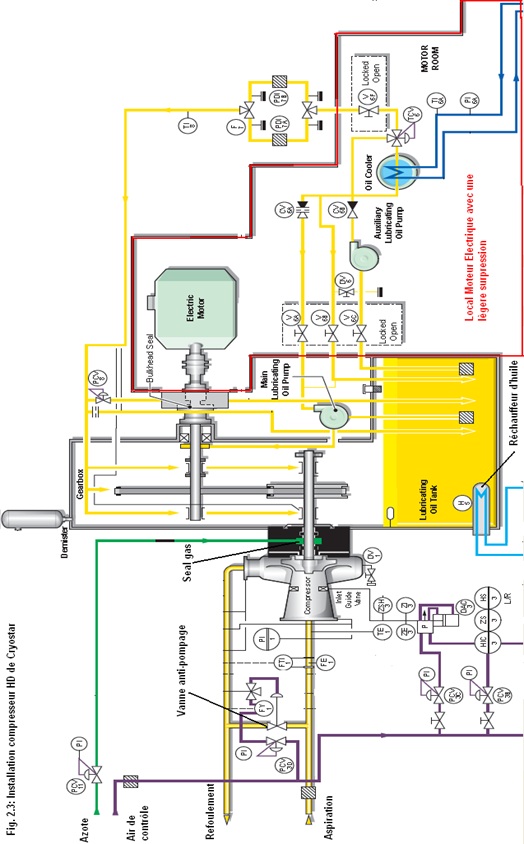 L’installation est équipée d’un carter pour stocker de l’huile. Le carter est muni d’un réchauffeur à vapeur pour garder l’huile à la bonne température et pour éviter la condensation pendant l’arrêt du compresseur. Le circuit de graissage dispose de deux pompes. La pompe principale est attelée au moteur électrique du compresseur par le biais d’un réducteur. La deuxième pompe est une pompe électrique utilisée en pré-graissage et réchauffage du multiplicateur de vitesse. Cette dernière se met en stand-by lorsque le compresseur est en marche. Le circuit est équipé de deux capteurs de pression séparés, le premier alimente la pompe électrique en cas de baisse de pression de l’huile fournie par la pompe principale et le deuxième arrête l’installation si la pression tombe en dessous d’une certaine valeur. L’huile passe à travers un réfrigérant à eau de mer ou à eau douce selon les installations, une vanne thermostatique à trois voies permet la régulation de la température. Puis elle passe à travers un des deux filtres équipés d’indicateur différentiel de pression et d’un système de changement automatique de filtre en service en cas d’encrassement. Une vanne régulatrice de pression permet de réguler le débit d’huile vers les paliers. L’excès d’huile passe à travers un by-pass vers le carter.