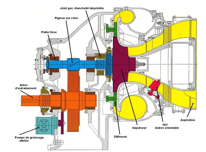 – Un arbre portant l’impulseur (roue) généralement monté en porte à faux, les parties en mouvement nécessitent un parfait équilibrage vu la grande vitesse de rotation