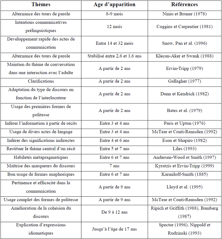 Tableau 2 : Développement des capacités pragmatiques (d’après Adams, 2002)
