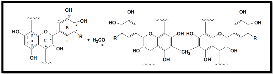 Les colles de bois issues de tanins condensés-formaldéhyde ont été utilisées industriellement depuis les années 1970, pour le collage du bois intérieur et extérieur tels que les panneaux de particules et de contreplaqué (Pizzi, 2003). Elles sont obtenues par durcissement des polymères flavonoïdes par polycondensation avec le formaldéhyde impliquant leurs cycles réactifs comme le montre la figure 2.