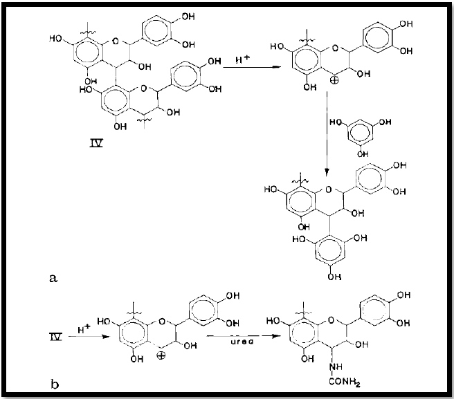 Le rendement du tanin de pin extrait pour une utilisation comme adhésif pour le bois peut être considérablement augmenté en réduisant au minimum l’autocondensation des tanins en phlobaphenes ce par l’addition de petites quantités d’un nucléophile (figure 3) l’urée (Sealy-Fisher et Pizzi., 1992).