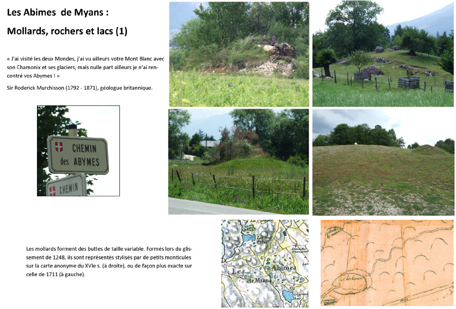 L’ensemble du paysage des Abîmes de Myans témoigne de l’importance de cet évènement encore aujourd’hui, après plus de sept siècles de transformations et d’aménagements. Mais ce sont certainement les textes contemporains de la catastrophe qui permettent d’en appréhender toute l’ampleur.