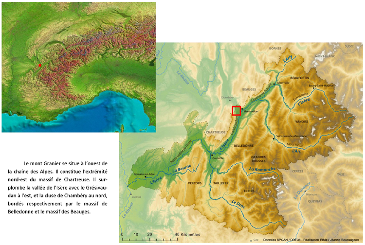La zone étudiée se situe dans la région Rhône-Alpes, au sud-est de Chambéry, où la cluse du même nom rejoint la vallée de l’Isère. (voir figure 1) Ce carrefour de communication est bordé par les Massifs de Chartreuse, Belledonne et des Bauges (voir figure 2). Le massif du Granier, qui limite au nord-est le massif de Chartreuse, domine la vallée de l’Isère (voir figure 4). Il est connu des spéléologues pour son important réseau de galerie, le troisième de France. Il abrite aussi le plus important gisement d’ossements d’ours des cavernes d’Europe, dans la grotte de la Balme à Collomb. Les communes des Marches, Apremont et Myans ont été recouvertes partiellement, au milieu du XIIIe s. (probablement en l’an 1248), par une coulée de boue gigantesque qui a entrainé un pan du massif du Granier. Cette catastrophe, qui a fait environ mille victimes et disparaitre plusieurs villages, a certainement forgé un paysage que l’on pourrait qualifier de lunaire, mêlant boues, marnes et rochers ayant atteint des tailles incroyables (voir figure 5 sur la pierre hachée). Les hommes sont venus très tôt se réinstaller sur ces terres désolées qui ont d’abord servi de pâturages, avant d’être petit à petit remises en valeur. Aujourd’hui le mont Granier porte les stigmates de cette catastrophe, tout comme les trente kilomètres carrés qui s’étendent sur son versant et à ses pieds, et qui portent le nom évocateur d’Abîmes de Myans (voir figure 3). Cet évènement est aussi à l’origine de la naissance du sanctuaire de la vierge de Myans, l’un des plus importants de la région. (suite page 14)
