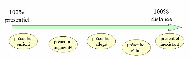 En fonction de cette typologie Compétice, on parle de cinq scénarii(4): le présentiel enrichi, le présentiel amélioré ou augmenté, le présentiel allégé, le présentiel réduit, le présentiel (quasi)inexistant (Anna Vetter, 2005).