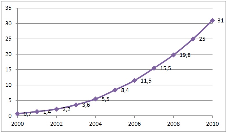 de 45% en moyenne par an sur la période 2000 – 2010 et représentent aujourd’hui 87% du
