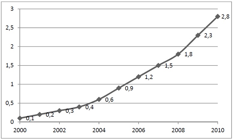 Figure 1. Evolution des ventes en ligne aux particuliers entre 2000 et 2010 (en milliard d’euros)