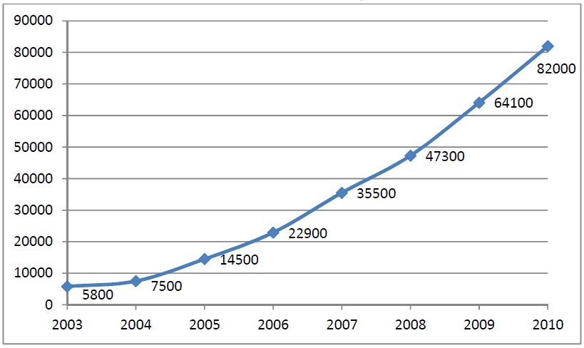 Figure 4. Evolution du nombre de sites de commerce en ligne actifs entre 2003 et 2010