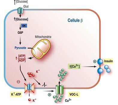 Le glucose pénètre dans la cellule β (cf. figure 3) par l’intermédiaire d’un transporteur spécifique (GLUT-2), il est phosphorylé en glucose-6-phosphate par la glucokinase puis utilisé principalement par la voie de la glycolyse et de la respiration oxydative. Le métabolisme du glucose dans la cellule β est à l’origine d’une production d’ATP. La génération d’ATP conduit à l’inactivation des canaux K+/ATP, entraînant une dépolarisation membranaire et l’ouverture de canaux Ca++ voltage-dépendants, aboutissant finalement à l’augmentation massive de la concentration cytosolique du calcium et stimulation de l’exocytose des granules de sécrétion d’insuline. [Magnan et al., 2005]
