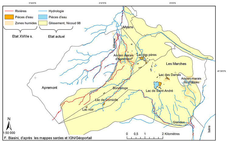 Le nombre total de pièces d’eau relevées sur les mappes sardes des Marches et d’Apremont est de trente-huit(78). Leur taille varie de 157 mètres carrés pour la plus petite à 100 513 mètres carrés pour le lac de Saint-André. Elles occupent 210 790 mètres carrés soit 0,43% de la surface totale des trois communes des Marches, Myans et Apremont.
