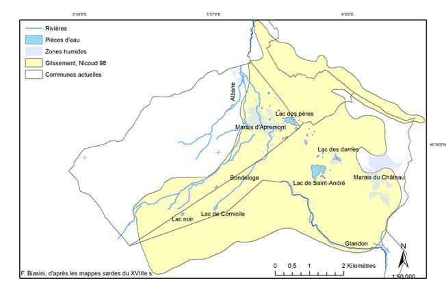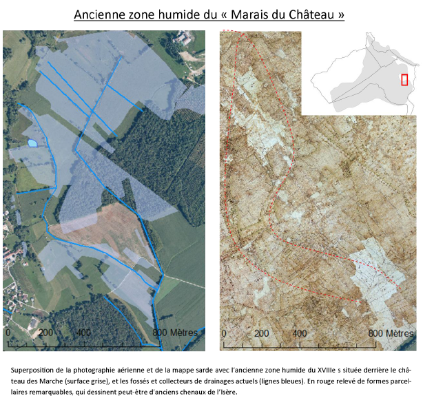 Cette supposition est renforcée par le témoignage de l’abbé Chamousset qui parle d’une zone marécageuse importante au milieu du XIXe s. : « Tout l’espace compris entre le chef-lieu et Saint-André était inhabitable. On ne voyait là que quelques rares maisons et dans ces maisons que des fiévreux. » (Guillaumin, 1937, pp 610-611). Aujourd’hui les deux grandes zones des marais d’Apremont et du château sont aménagées et drainées par de profonds collecteurs et fossés(79).