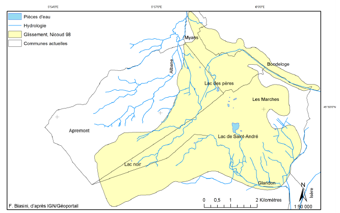 L’éboulement du mont Granier a redéfini la topographie de ses versants tout comme l’ensemble de son réseau hydrographique (Pachoud A., 1998 b). Celui-ci marque l’identité des Abîmes de Myans, en particulier par ses nombreux lacs(75) qui sont représentés sur les plus anciens documents cartographiques.