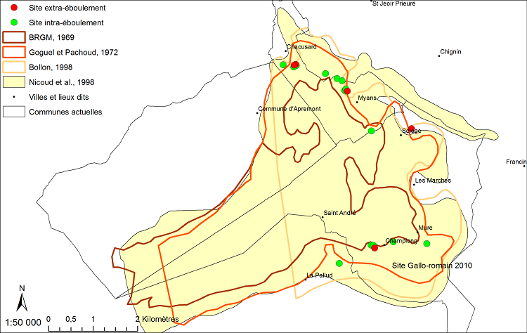 Néanmoins, Des interrogations demeurent sur la répartition des différents matériaux glissés au sein de la coulée de boue, ou encore la possibilité d’évènements géologiques antérieurs au XIIIe s.(73). Par exemple, la récente découverte de vestiges gallo-romains en place dans la zone théoriquement recouverte par l’éboulement a bouleversé ces acquis (AMPM, Bulletin n°8, 2010). La distance entre ce site et les limites proposées jusqu’à présent est de plus d’un kilomètre. Une cartographie sommaire de la répartition spatiale des galets calcaires (théoriquement intra-éboulement) et des galets alpins ( théoriquement extra-éboulemement) affleurant à la surface du sol a permis de mettre en évidence d’autres sites qui posent question.