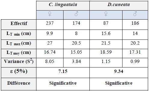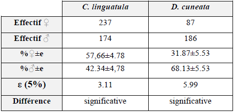 L’étude du sex-ratio de C.linguatula a porté sur un effectif de 411 individus dont 237 femelles et 174 mâles, et de 273 individus pour D.cuneata soit 87 femelles et 186 mâles. Les résultats sont consignés dans le tableau suivant :