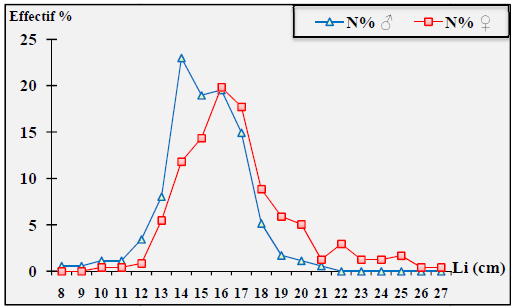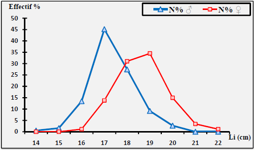 Chez C. linguatula, il est à noter l’existence de trois modes successifs chez les femelles à 16cm, 22 cm puis à 25 cm, alors que chez les mâles on note la présence de deux modes le premier à 14 cm et le deuxième à 16 cm.