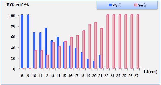 Les résultats des tableaux 1et 2 (annexe I) sont illustrés par les histogrammes des figures 9 et 10 Chez C.linguatula le sex-ratio est en faveur des mâles jusqu’à la taille de 14 cm avec une dominance totale (100 %) dans les deux premières classe de tailles. À une longueur de 15cm on note un équilibre entre les deux sexes (49,25% de mâles et de 50,75 % de femelles), au-delà de cette taille le pourcentage des femelles prend le dessus, il est a noté une absence totale de mâles dans les classes de tailles allant de 22 à 27 cm.