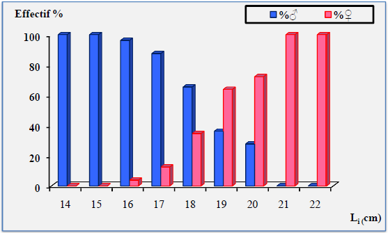 L’évolution du sex-ratio chez D.cuneata en fonction des classes de tailles est illustrée par les histogrammes de la figure 10. Nous constatons une prépondérance des mâles dans les cinq premières classes, avec absence totale des femelles à 14 et 15 cm. À partir d’une taille de 19cm les femelles prennent le dessus jusqu’à disparition du sexe opposé dans les grandes classes de taille (21, 22 cm).