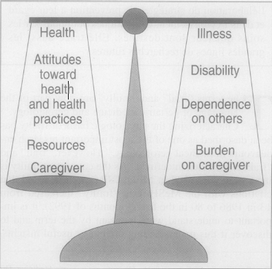 Brocklerhust (cité par Rockwood, 1994) représente la fragilité par une balance. D’un côté se trouvent les facteurs favorables qui permettent à la personne de maintenir son indépendance (santé, attitudes à l’égard de la santé, ressources et aidants). L’autre côté reprend les éléments qui menacent l’indépendance de la personne (maladie, incapacité, dépendance et épuisement des aidants).