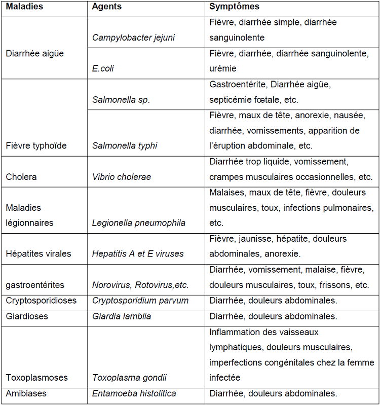 Un des risques majeurs sur la santé des êtres vivants liés aux DM est sans doute la contamination microbienne (Mashhood, 2011). L’exposition aux microbes peut se réaliser par ingestion des aliments contaminés, inhalation de l’air ou par absorption directe à travers les tissus épithéliaux et peut conduire aux infections mortelles chez l’homme et à la biodiversité (Katarina and Payment, 2005) Les microorganismes, les infections et les symptômes associés sont repris dans le tableau suivant :