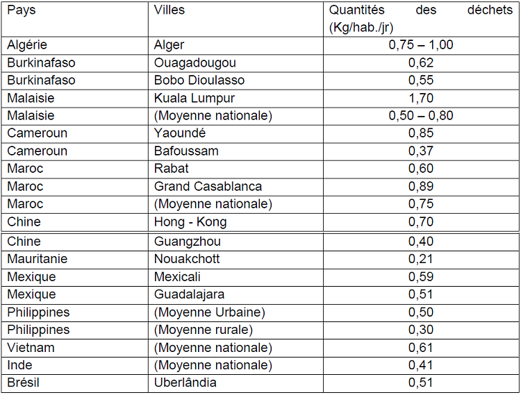 Les quantités des déchets produits par habitant dans certaines villes des PED sont reprises dans le tableau ci-dessous :