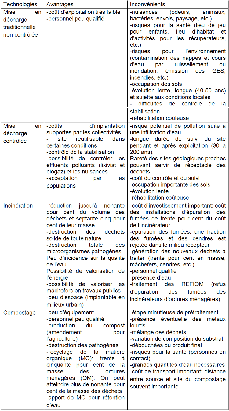 Tableau 9 : Avantages et désavantages des différents modes de traitement des déchets (Charnay, 2005 p.29; Aloueimine, 2006 p.75)
