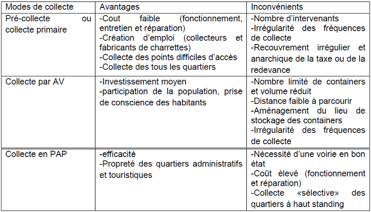 Les avantages et les inconvénients des méthodes de collecte de déchets sont repris dans le tableau suivant.