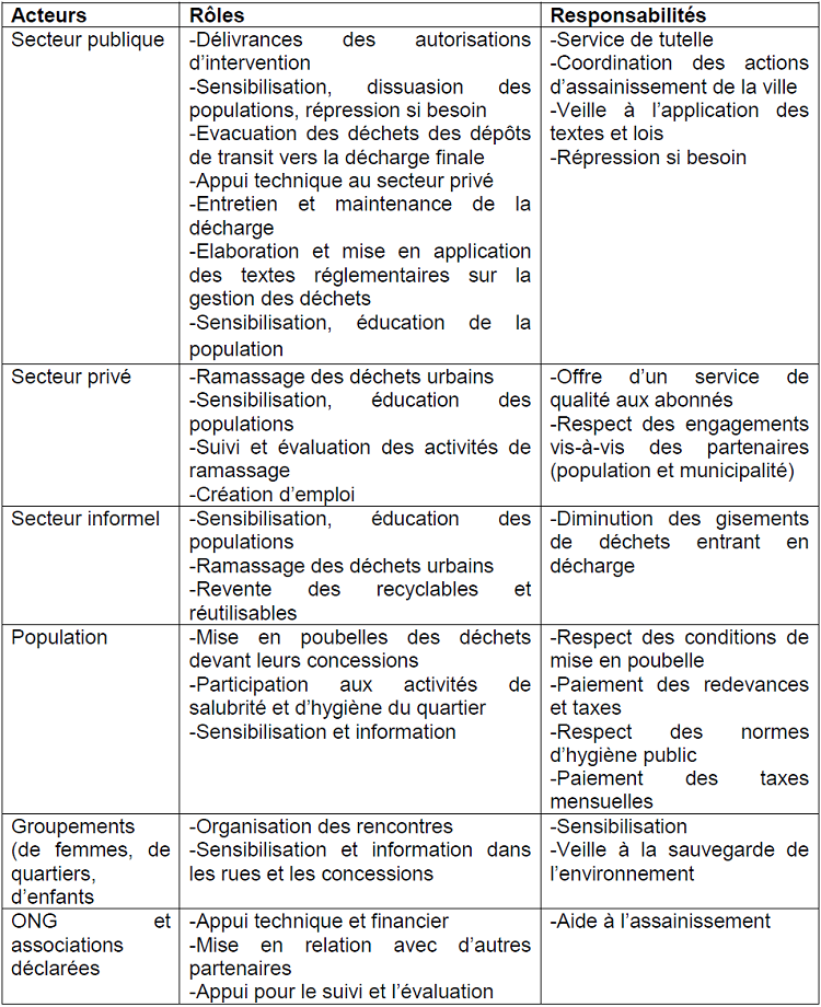Nombreux acteurs interviennent dans la gestion des DM des PED à différents niveaux quand bien même les responsabilités en matière de gestion quotidienne des DM reviennent aux autorités étatiques (Poormina et Manjula, 2001; Charnay, 2005; Aina, 2006). Les cinq acteurs qui se répartissent les lourdes tâches de gestion des DM dans les PED sont: i) le secteur publique représenté par la mairie urbaine; ii) le secteur privé formé des petites et grandes entreprises; iii) le secteur informel composé soit des particuliers rassemblés en associations dans des quartiers soit des petites entreprises non officielles qui s’occupent de la pré-collecte porte à porte; iv) la population, premier producteur des DM, qui contribue par les impôts et les taxes locales; v) les ONGs et les associations, très nombreuses dans les PED, qui contribuent à la collecte des déchets, au transport et stockage à l’extérieur de la ville (Poormina et Manjula, 2001). Par exemple la collecte des DM au Burkina Faso est assurée par le secteur public, les services techniques municipaux (SETEMU) attachés aux ministères de l’administration, des travaux publics, de l’habitat et de l’environnement et du cadre de vie.